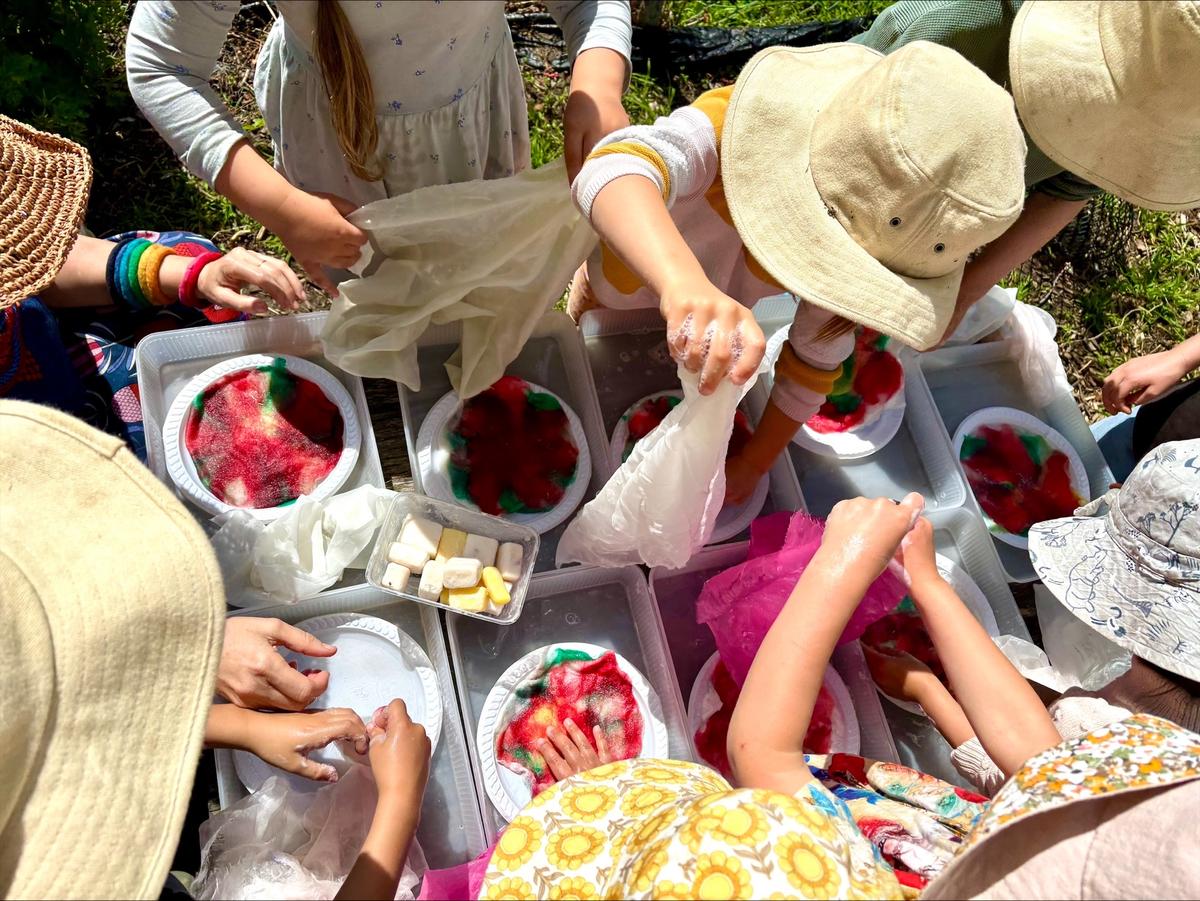 They delighted in the sensory experience of the process—making bubbles in warm soapy water, singing as they worked, and using their enthusiastic hands to transform soft, fluffy wool fleece into strong, vibrant felt. A truly magical creation!