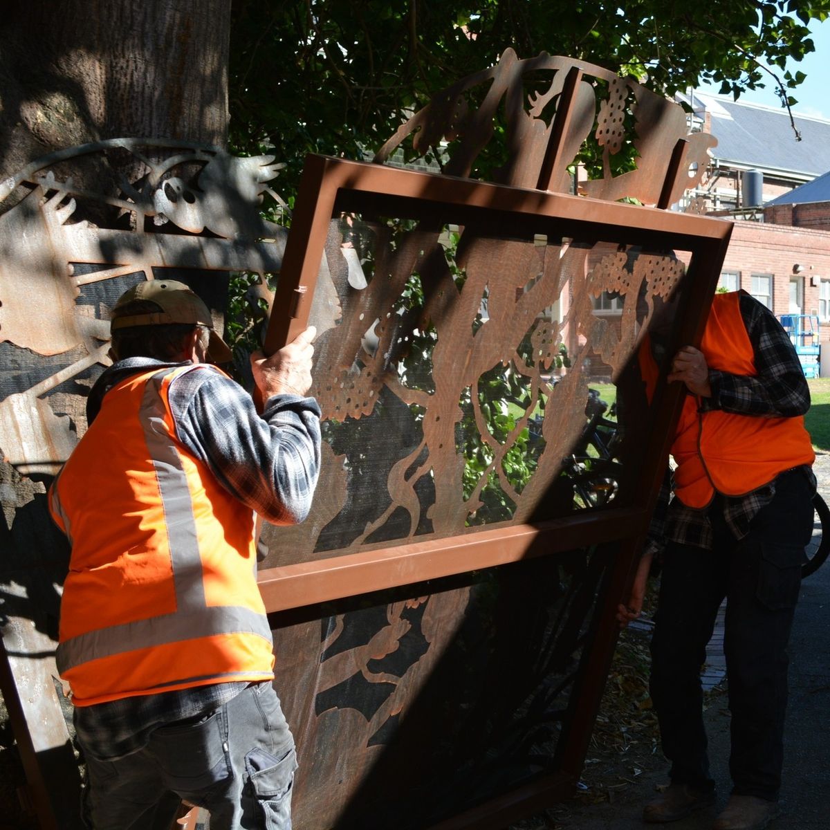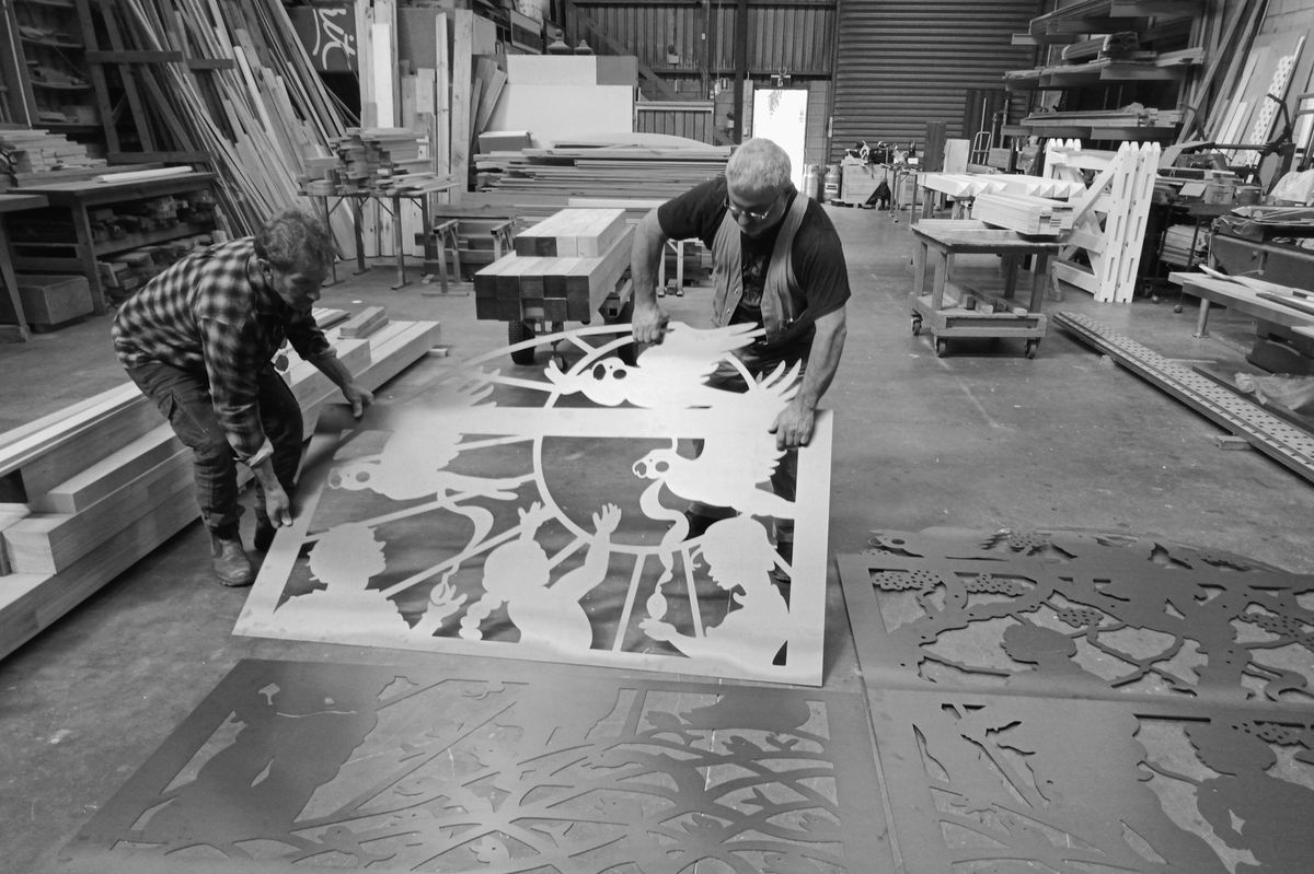 Under the golden flush of wattle the eels swim an ancient migration. The land hears the sound of children, from many histories and with voices very pure, and black cockatoos cry their longing to the sky. The imagery of Sophia Mundi Steiner School’s 40th Anniversary Gate was gently born from initial consultations with the College of Teachers; discussions where landscape, memory, pedagogy and spirituality combined. Symbolic pictures to signify the soul life (eels) and spirit life (birds), along with the presence of a great river thrumming its song of many running waters, creates a mirroring of the ecological landscape surrounding the school’s present location. The children are their own flowering in this artwork’s landscape, interconnected to the trees, the river and land’s wild creatures, symbolising the Steiner pedagogy and its wisdom in growing the whole child. In the hands of three of the figures is a quiet burning flame, symbol of faith and reverence before the presence of Mystery. In all things I have sought to convey a sense of wonder. The strength of the eels’ migration, the gentle falling of the wattle and flight of the black cockatoos combine: With quietude, healing, resilience and joy, the children gaze in wonder at the risen radiant sun.